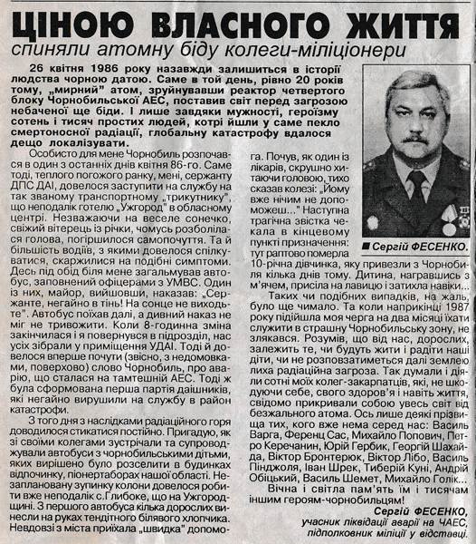 «Особисто для мене Чорнобиль розпочався в один з останніх днів квітня 1986 року. Саме тоді, теплого погожого ранку, я, сержант ДПС ДАІ, заступив на пост на так званому транспортному «Трикутнику», що неподалік готелю Ужгород в обласному центрі.