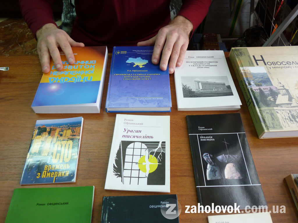 Роман Офіцинський демонструє власні видання: три збірки поезій збірок "Нашестя ангелів" (1993), "Ураган тисячоліть" (1997), "Ідеологія повстань" (2004), публіцистичні книжки "Сто вражень з Америки" (2001), "Дев’ять бокорашів і зрадлива Тиса" (2003), "Тяжко жити Касандрою" (2008). Автор представив також наукові видання, в яких присутні літературознавчі аспекти, останню монографію, присвячену Івану Франку (2011 року).