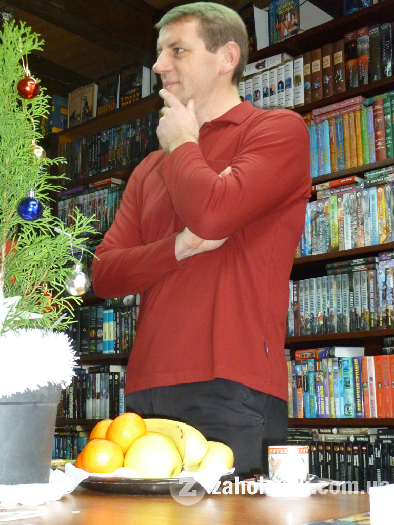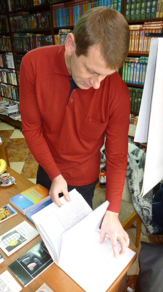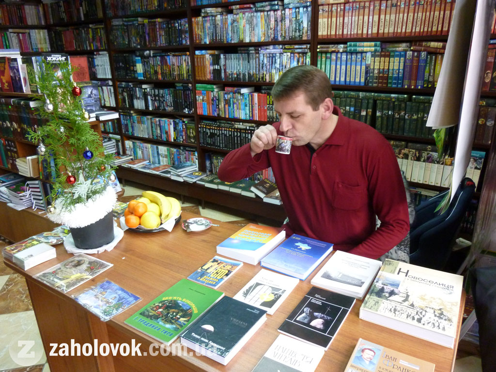 Вже о 12.00 науковець і письменник спілкувався з відвідувачами. Попиваючи каву, Роман Офіцинський демонстрував сій творчий доробок, обговорював з цінителями наукової думки та творчості літературні процеси тощо.