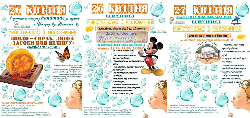 26 квітня о 14:00, 15:00, 16:00 відбудеться дитячий МК з миловаріння для діток від 5 до 12 років у кафе "Пластилін" за адресою вул.Корзо, 3.