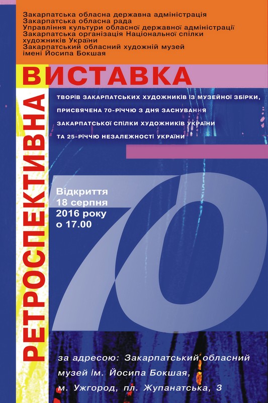 18 серпня в залах обласного художнього музею ім.Й.Бокшая відкриють ретроспективну виставку, присвячену 70-річчю від створення Закарпатської спілки художників та 25-річчю Незалежності України.