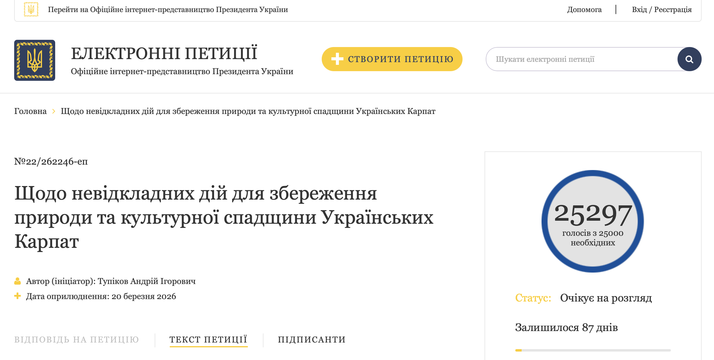 «Захист Карпат — це складова національної безпеки та стійкості держави у воєнний час. Коли ворог руйнує Україну ззовні, ми не можемо дозволити руйнувати її зсередини — знищуючи природні основи відновлення, водну безпеку, кліматичну адаптацію та культурну ідентичність. Просимо забезпечити, щоб принцип верховенства права переважав над вузькогалузевими та короткостроковими інтересами, а Карпати залишилися живими для нас, для Європи і для майбутніх поколінь», – зазначається у петиції про захист Карпат від забудови.