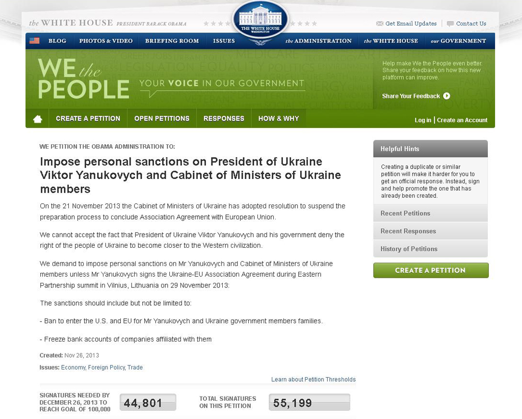 Петицію, в якій міститься прохання до адміністрації президента США запровадити санкції проти президента України Віктора Януковича за відмову від підписання Угоди про асоціацію з ЄС протягом дня підписало вже майже 56 тисячі людей.