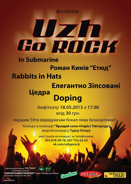 Рок-фестиваль "Uzh GoRock" пропонує ужгородцям 6 годин живої»рок-музики. Під час фесту свою творчість представлять ужгородські рок-колективи. Це перший такий фестиваль на регіональному рівні.
