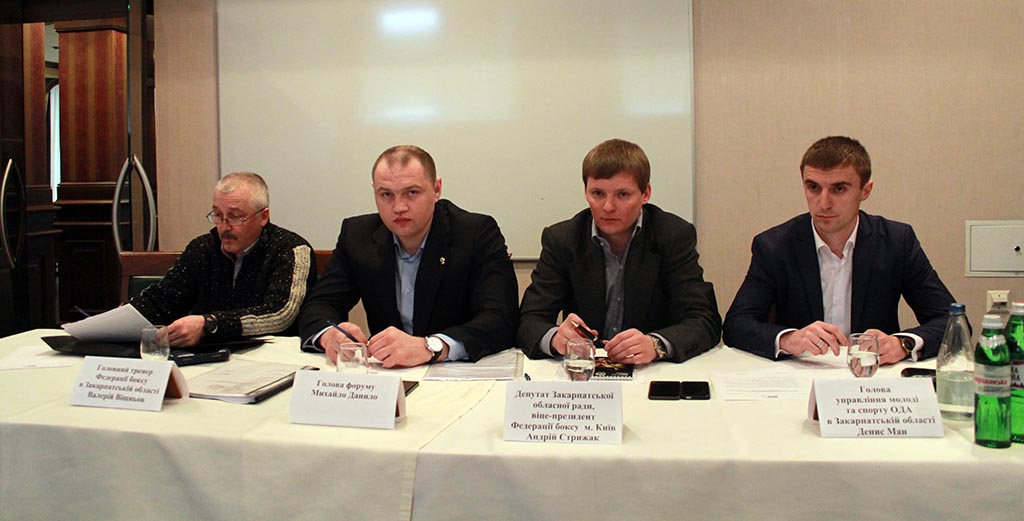 До складу Президії Форуму увійшли: начальник управління молоді та спорту Закарпатської ОДА Денис Ман, депутат Закарпатської обласної ради, віце-президент Федерації боксу м. Києва Андрій Стрижак, головний тренер збірної області з боксу Валерій Вішньов. Захід тривав під головуванням майстра спорту міжнародного класу Михайла Данила. Юридично-правову допомогу забезпечував секретар Форуму Роман Любка, директор правової групи «Граніт».