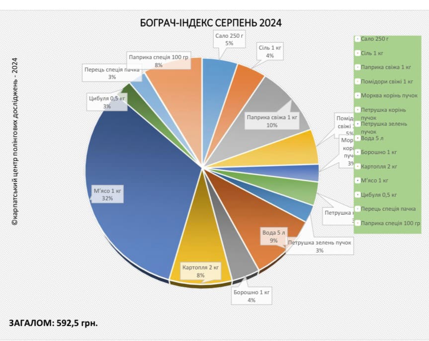 Відповідно до «індексу бограча» якщо за липень 2024 року на родину з п’яти людей потрібно було витратити 640 гривень, то у серпні 2024 року різниця цін склала 48 гривень – і загальна вартість продукції за «Бограч-index» – 592 грн, тобто зміна цін відбулася на 7,5%