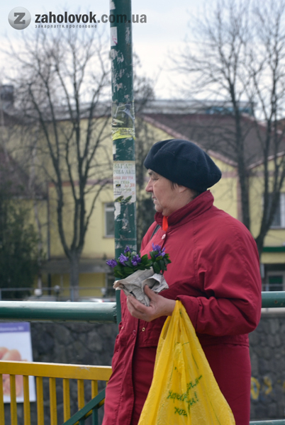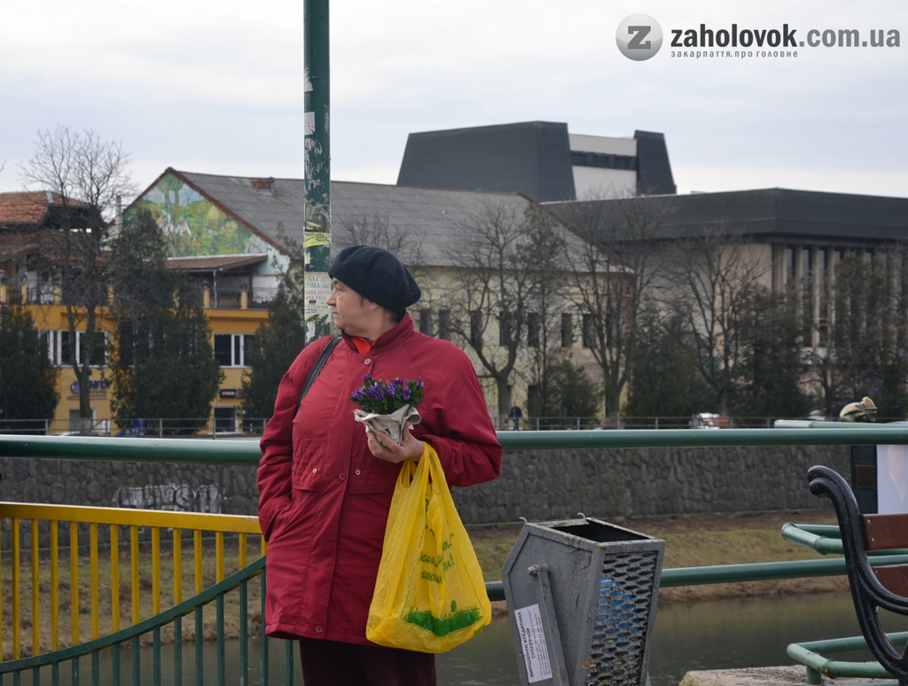 На вихідних вперше були помічені на пішохідному мості у центрі Ужгорода продавці з букетиками. А от сьогодні знов жінка з підсніжниками появилася на місці своїх попередників.