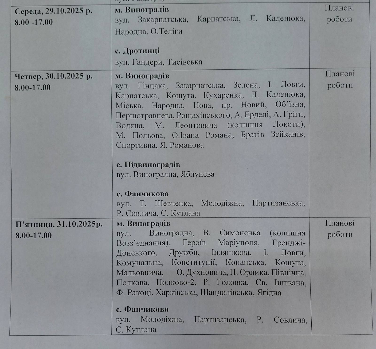 вт, 28/10/2025 - 18:41 Виноградівська міська рада відповідно до інформації ПрАТ «Закарпаттяобленерго» повідомляє про планові відключення електричної енергії. Автор: Gabriella Rudenko Новини інших ЗМІ Коментувати Ваше ім'я Електронна пошта Вміст цього поля є приватним і не буде доступний широкому загалу. Коментар Про текстові формати Comment Дозволені теґи HTML: <em> <strong> <cite> <code> <ul type> <ol start type> <li> <dl> <dt> <dd> Рядки й абзаци переносяться автоматично. Адреси вебсторінок та адреси електронної пошти автоматично перетворюються у посилання. CAPTCHA Мета цього запитання — довести, що ви є реальним відвідувачем і запобігти автоматизованим розсиланням спаму. Зберегти Залиште це поле порожнім