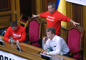 Сьогодні вранці в залі засідань перебувають близько 30-40 депутатів фракцій УДАР, Батьківщина і Свобода, які блокують трибуну і президію парламенту.