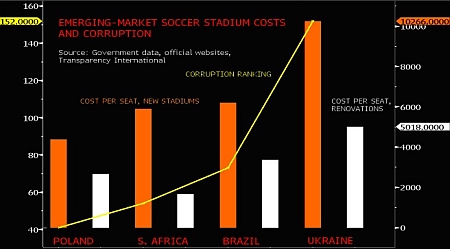 На графіку дня виданням порівнюються позиції двох країн, що приймають Євро-2012, в Індексі сприйняття корупції, який складається Transparency International, а також вартість будівництва та модернізації стадіонів для проведення червневого чемпіонату в розрахунку на одне місце.