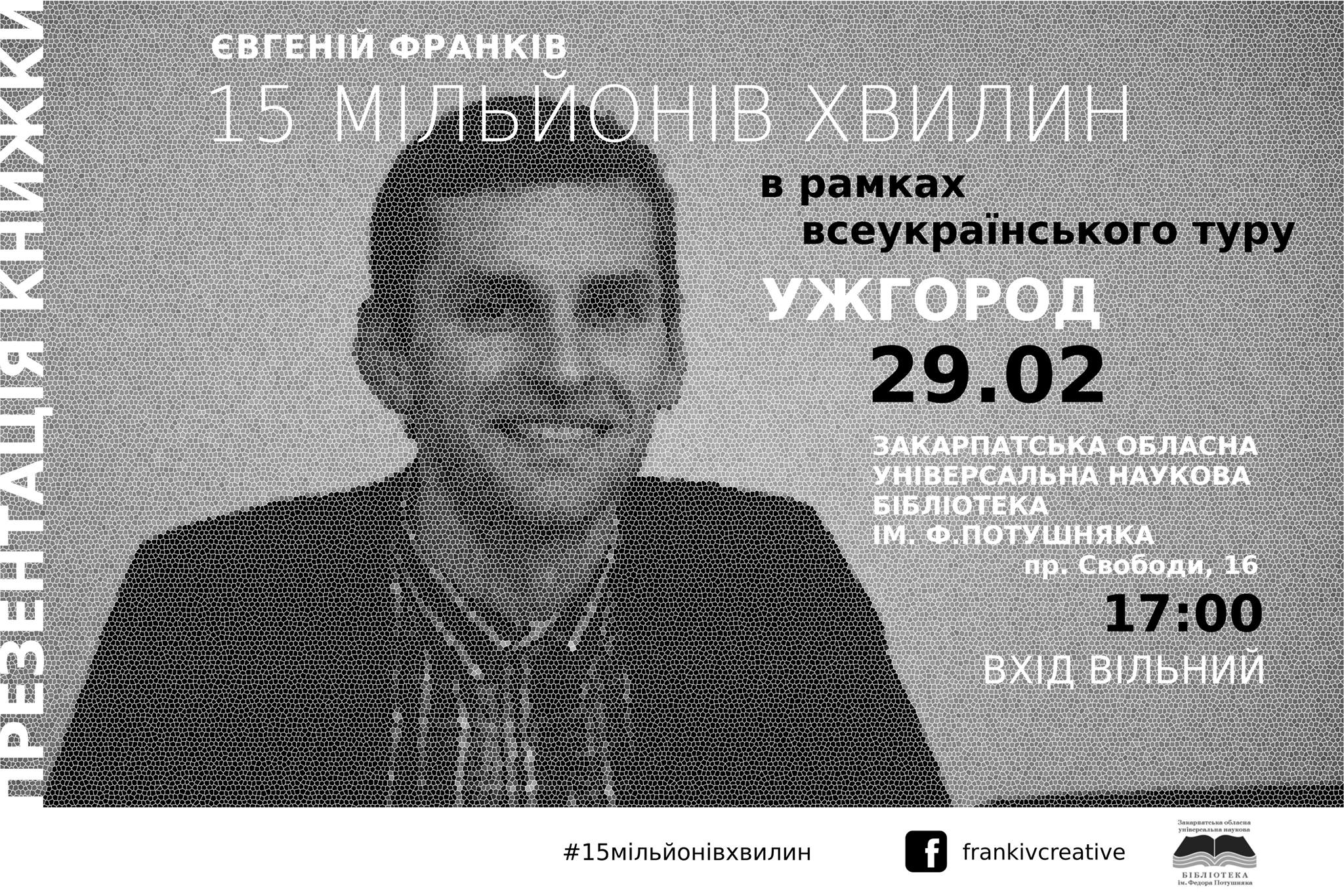 29 лютого о 17.00 в Закарпатській обласній універсальній науковій бібліотеці ім.Ф.Потушняка в рамках Всеукраїнського туру відбудеться презентація книги «15 мільйонів хвилин». Дебютує з книгою поет з м.Рівне – Євгеній Франків.