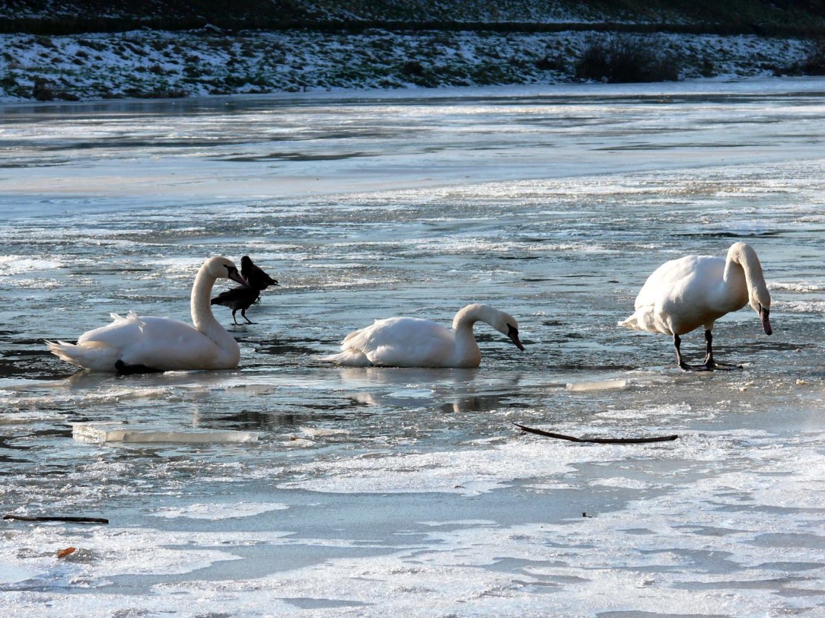 Також лебеді та качки їдять розмочений хліб та зерно: пшеницю, овес. Зерно слід висипати при березі (на воді воно потоне). Проте не варто перегодовувати птахів, оскільки це може загрожувати їхньому здоров’ю.
