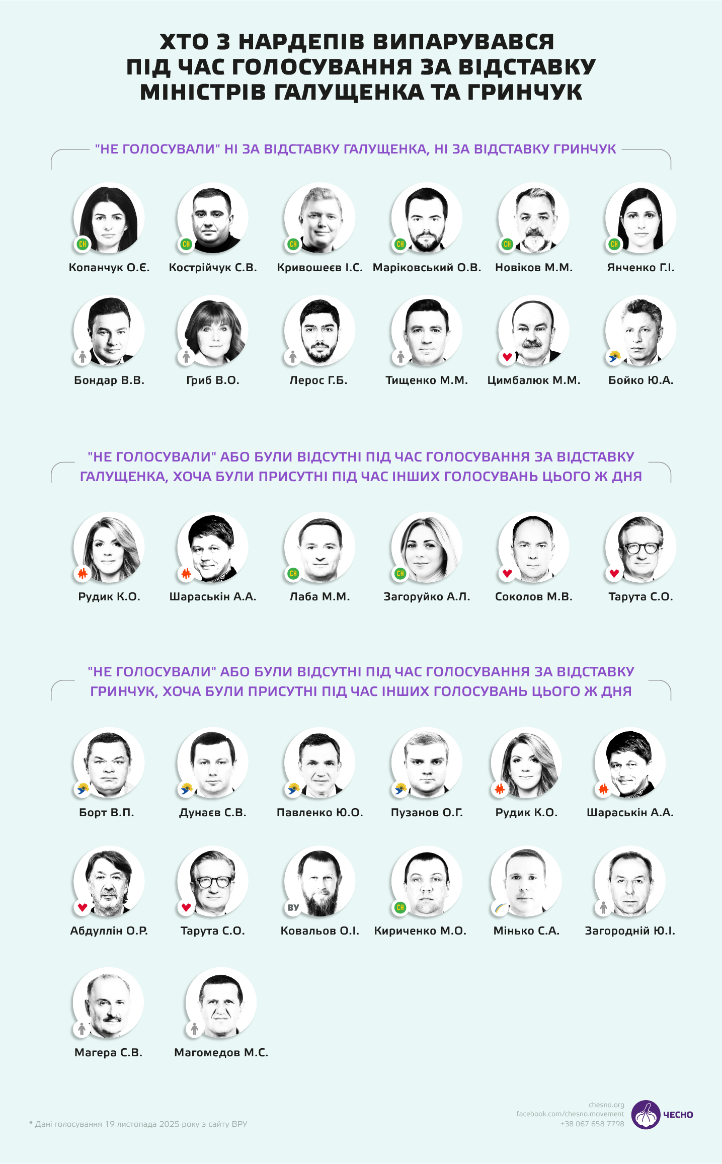 «Серед проросійських депутатів у відсотковому співвідношенні підтримка звільнення замішаних в корупційному скандалі міністрів була дещо нижчою, ніж в інших фракціях і групах. Також не настільки одностайною була позиція всередині «Батьківщини» та «За майбутнє». Водночас серед членів «Слуги народу», «Євросолідарності» та «Довіри» понад 80% голосували за», – пише Рух Чесно.