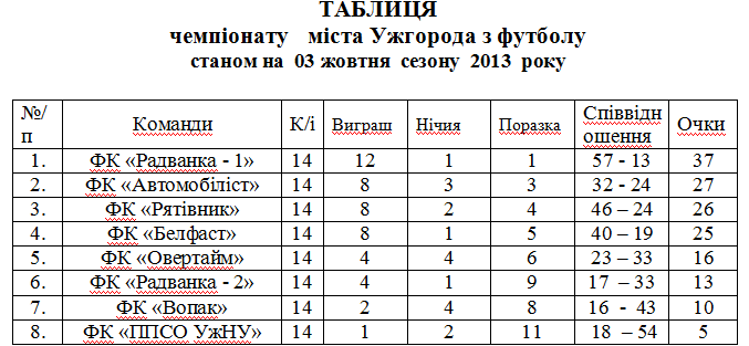 «Вітаю всіх учасників чемпіонату Ужгорода з футболу. Окрема вдячність - президентам клубів та спонсорам, завдяки їхній праці та любові до футболу гра №1 в місті Ужгороді розвивається, - коментує закінчення чемпіонату голова Федерації футболу міста Ужгорода Віктор Качур. - ФК «Радванку» вітаю з другим чемпіонством поспіль та досягненням минулорічних показників в турнірній таблиці. Організація на високому рівні у вас була не тільки на полі, але і у роботі клубу, що й призвело до такого хорошого результату. ФК «Автомобіліст» за підсумками сезону 2013 посів друге місце, хоч по підбору виконавців та за рівнем багатьох ігор заслуговував на медалі найвищого гатунку. ФК «Рятівник» протягом всього чемпіонату очолював турнірну таблицю і впевнено рухався до поставлених цілей, але кінцівка не вдалась і, за чотири тури до завершення чемпіонату, втратив шанси стати навіть другими, тому заслужене третє місце - наймолодшій команді чемпіонату міста. Особливу подяку висловлюю арбітрам, котрі на одному подиху, дуже достойно провели сезон 2013».