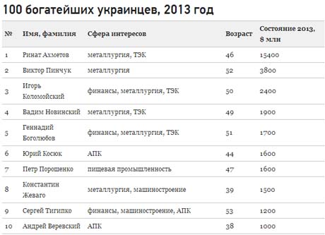 На першому місці рейтингу мільярдер Ринат Ахметов зі статками в 15,4 млрд доларів. На другому місці з великим відривом слідує Віктор Пінчук. Його активи оцінюються в 3,8 млрд доларів.