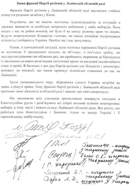 Як відомо, Львівська обласна організація Партії регіонів раніше виступила за відставку прем’єр-міністра Миколи Азарова, уряду та проведення перевиборів до Верховної Ради та президента.