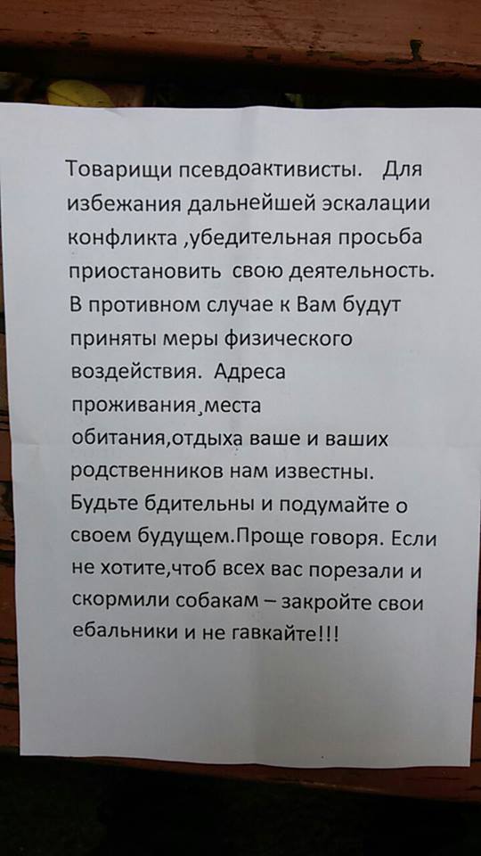 "На поштові адреси наших активістів поступили листи з погрозами фізичної розправи.