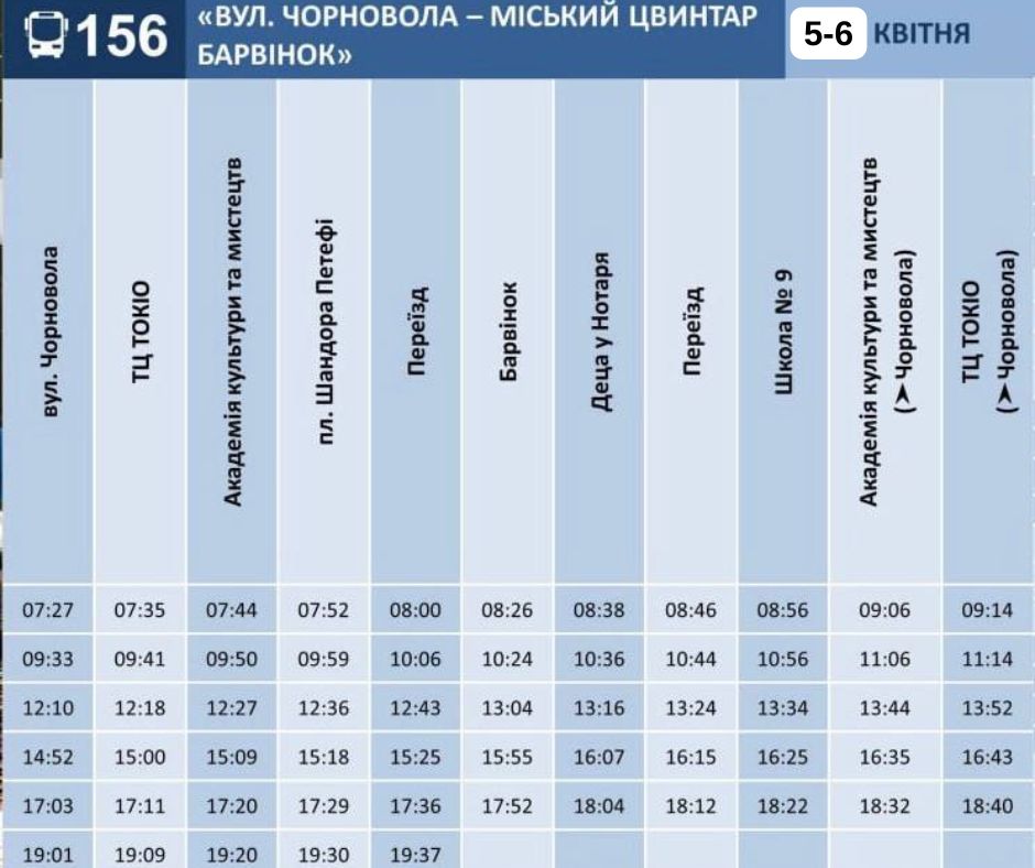 - №156 – вул. Чорновола - Міський цвинтар Барвінок