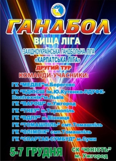З 5 по 7 грудня в спортивному комплексі "Юність" пройде ІІ тур Західно-української гандбольної ліги з гандболу серед чоловічих команд Вищої Ліги.