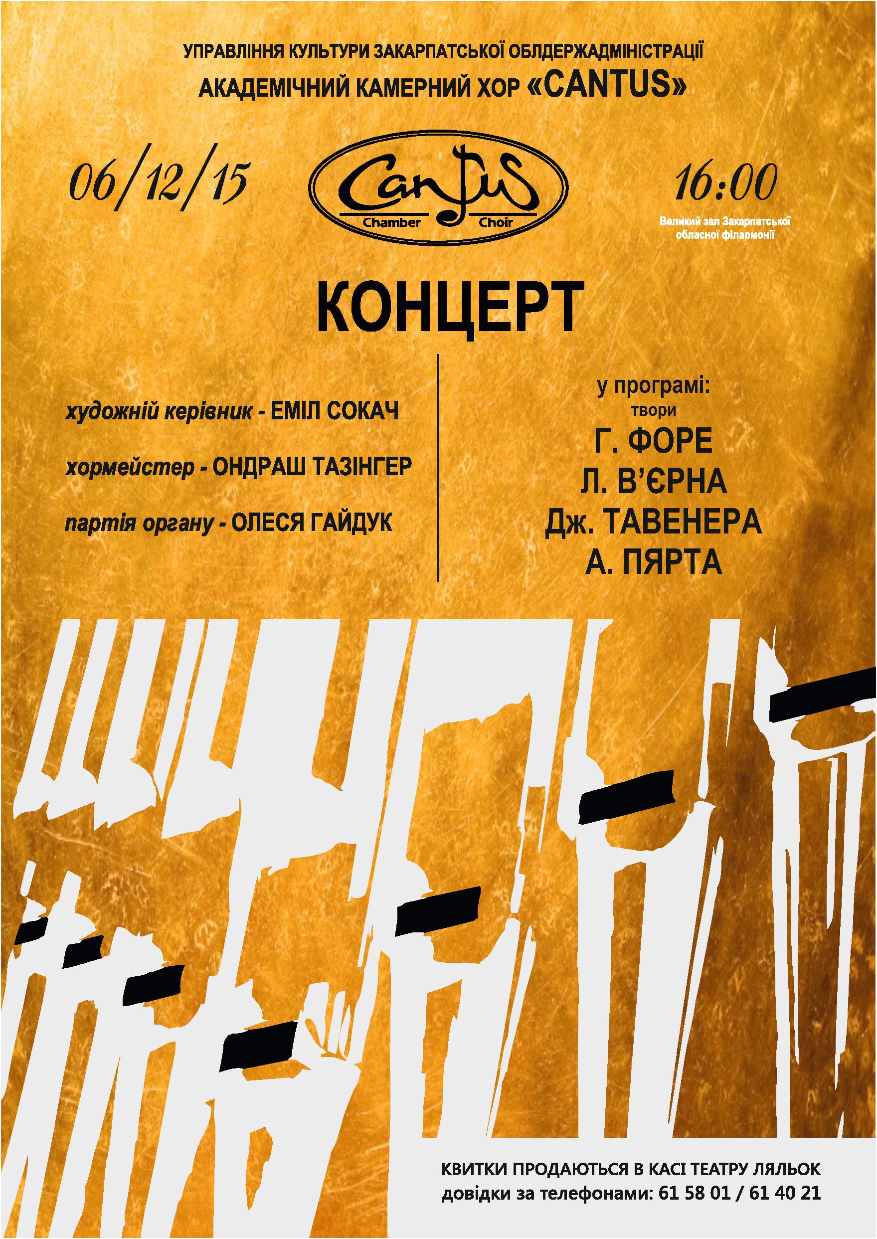 "Втіха та радість кожного меломана – французька музика. Вишуканість, витонченість, мелодична досконалість у творах Габріеля Форе, Моріса Дюрафле та Луї В’єрна. Дві мініатюри Джона Тавенера: унікальні в своїй лаконічності та глибині. Найбільш виконувані композитори з Прибалтики: Арво Пярт та Петеріс Васкс - полонили серця слухачів усього світу. Бах та Моцарт – без коментарів!", – так "Cantus"запрошує цінителів на концерт, що відбудеться у залі Закарпатської обласної філармонії 6 грудня о 16.00.