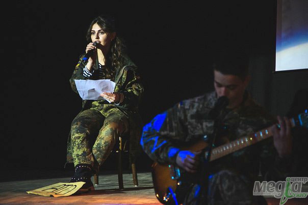 Гостру проблему сьогодення порушила й інша учасниця конкурсу – Марія Бровді, яка навчається на 5 курсі факультету суспільних наук УжНУ. Дівчина продекламувала авторський вірш на солдатську тематику. Допомагав їй друг-військовий, який під час виступу Марії акомпанував на гітарі.
