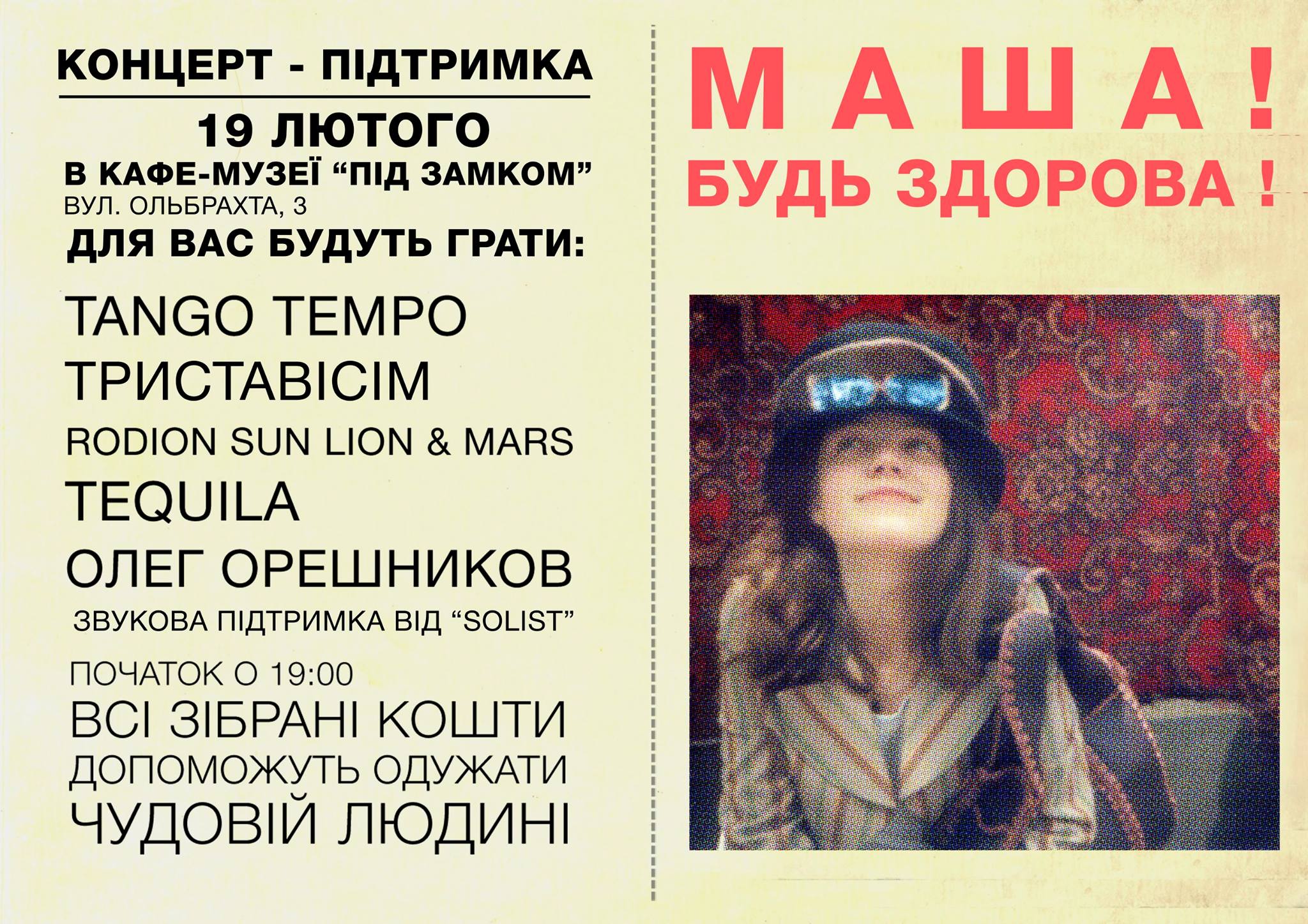 Зараз же був анонсований благодійний концерт "Маша! Будь здорова!", який відбудеться 19 лютого у кафе "Снек".