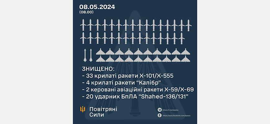 У ніч на 8 травня 2024 року російські окупанти завдали комбінованого удару ракетами різних типів та ударними БпЛА.
