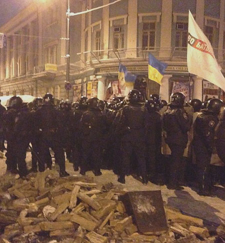 На розі вулиці Грушевського і Кріпосного провулку близько 1 години ночі почалася зачистка барикади силами міліції.