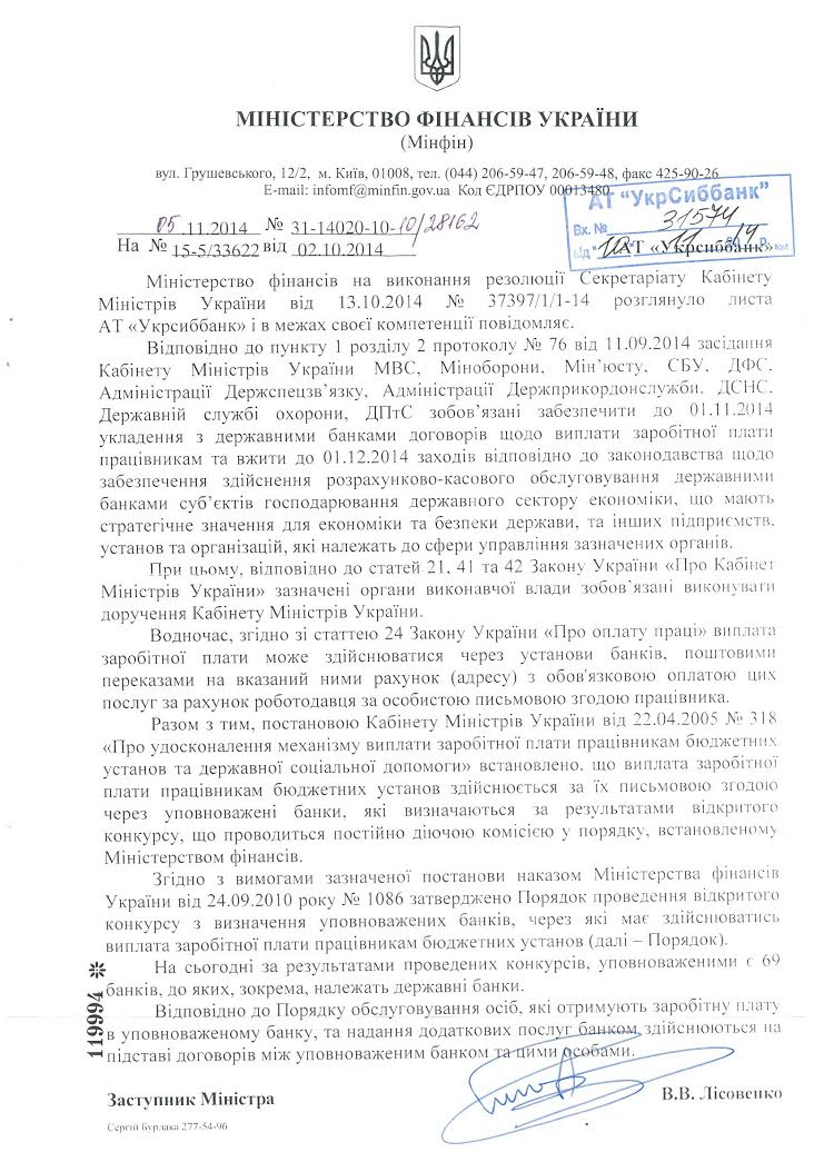 Міністерство фінансів України офіційно визнало, що протокольне рішення Кабінету Міністрів України № 76 від 11.09.2014 р., яке доручає державним органам і бюджетним організаціям укласти договори на отримання співробітниками заробітної плати виключно в державних банках, не відповідає чинному законодавству, і, відповідно, не обов’язкове для виконання на місцях.