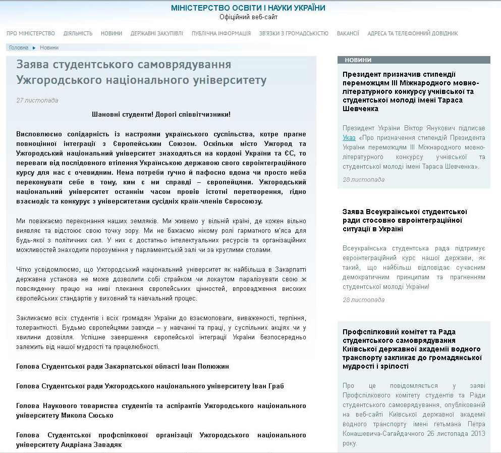 На офіційному сайті Міністерства освіти і науки України опублікували Заяву студентського самоврядування Ужгородського національного університету. За словами самих голів студентських організацій, заява не відповідає дійсності.