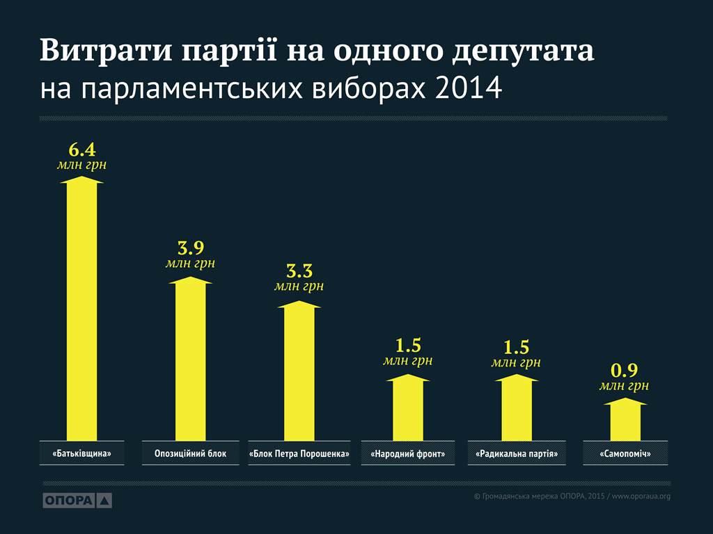 Рекордсменами за сумою виборчого фонду на дострокових парламентських виборах стали партії «Батьківщина» (109,5 млн грн), «Опозиційний блок» (106,4 млн грн), «Блок Петра Порошенка» (97,4 млн грн) і «Народний Фронт» (93,6 млн грн). Як відзначає Ольга Айвазовська, координатор парламентських і виборчих програм ОПОРИ, джерела походження «власних коштів» партії не розкривають, і очевидно саме в цьому проявляється їхня залежність від приватного фінансування з боку великого бізнесу. Разом з тим у щорічних фінансових звітах партій про доходи, видатки та майновий стан ця інформації відсутня.