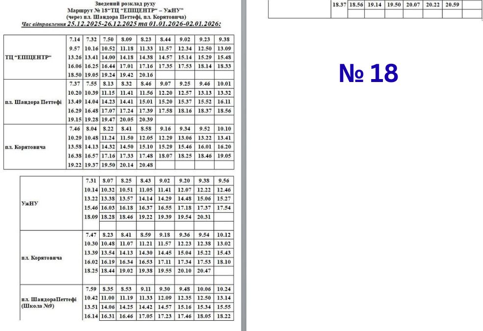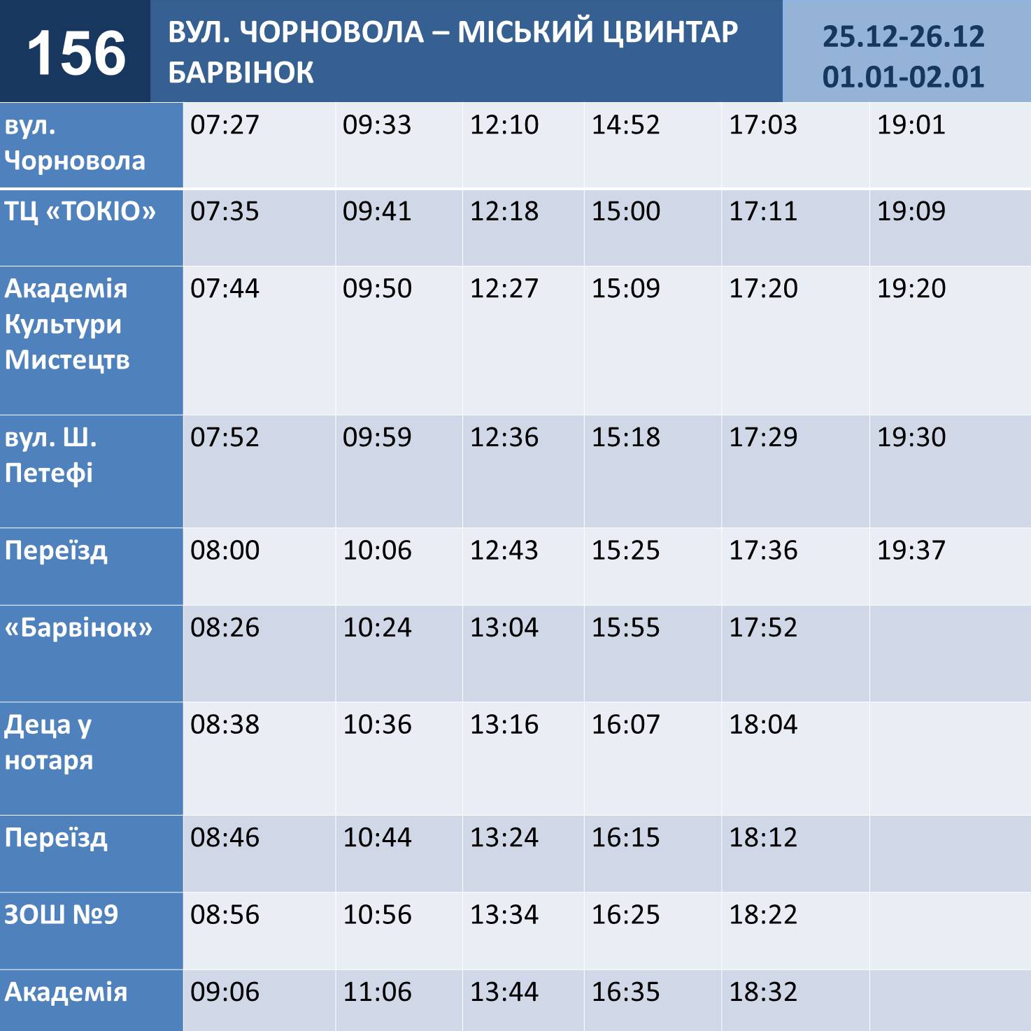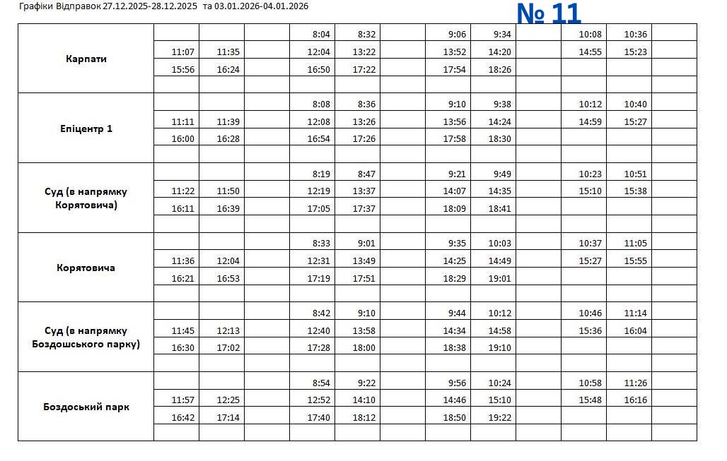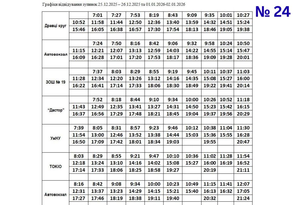 У період різдвяно-новорічних свят міські автобуси №9, №11, №18, №20, №22, №24 та №156 в Ужгороді курсуватимуть за оновленим графіком. Водночас автобус №38 не курсуватиме 25-28 грудня, а також 1-4 січня.