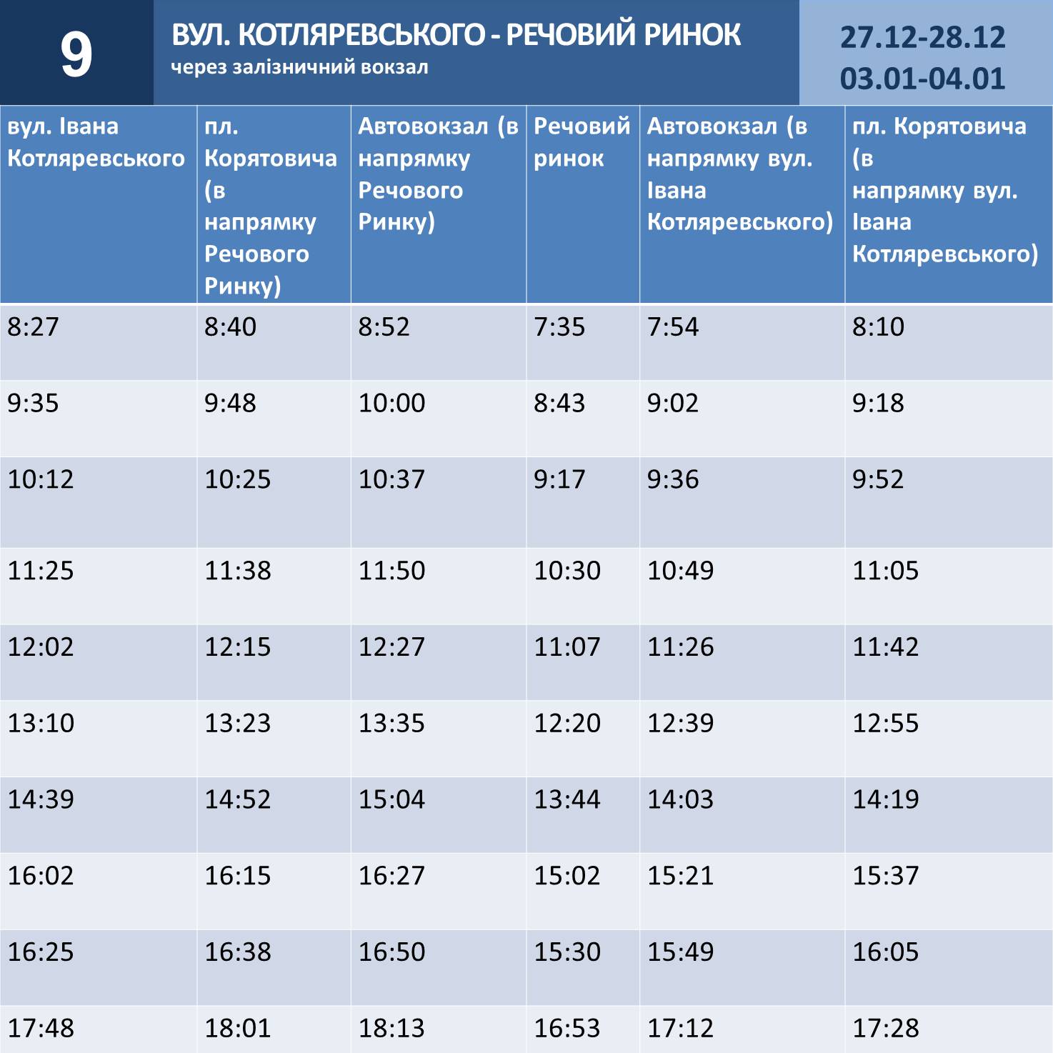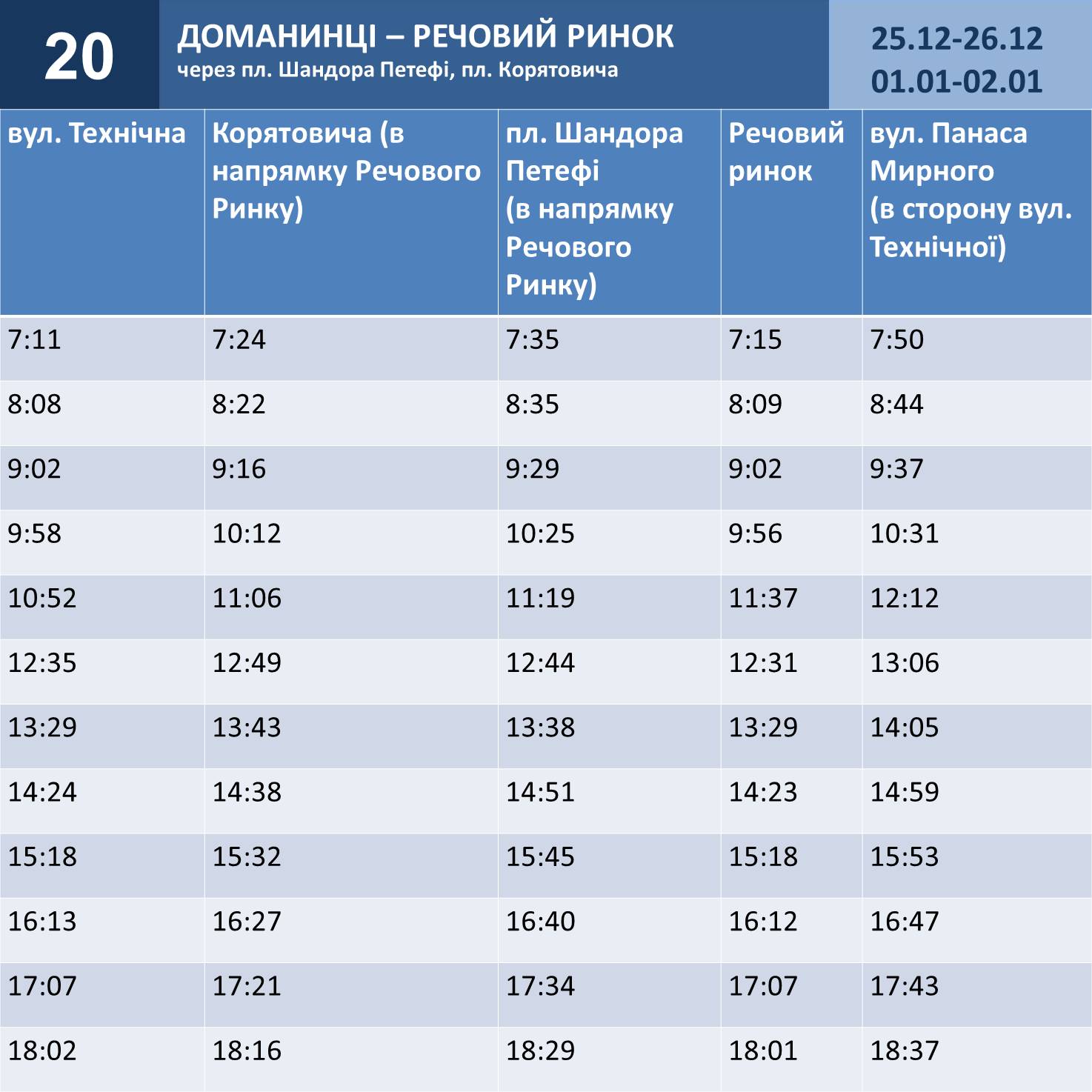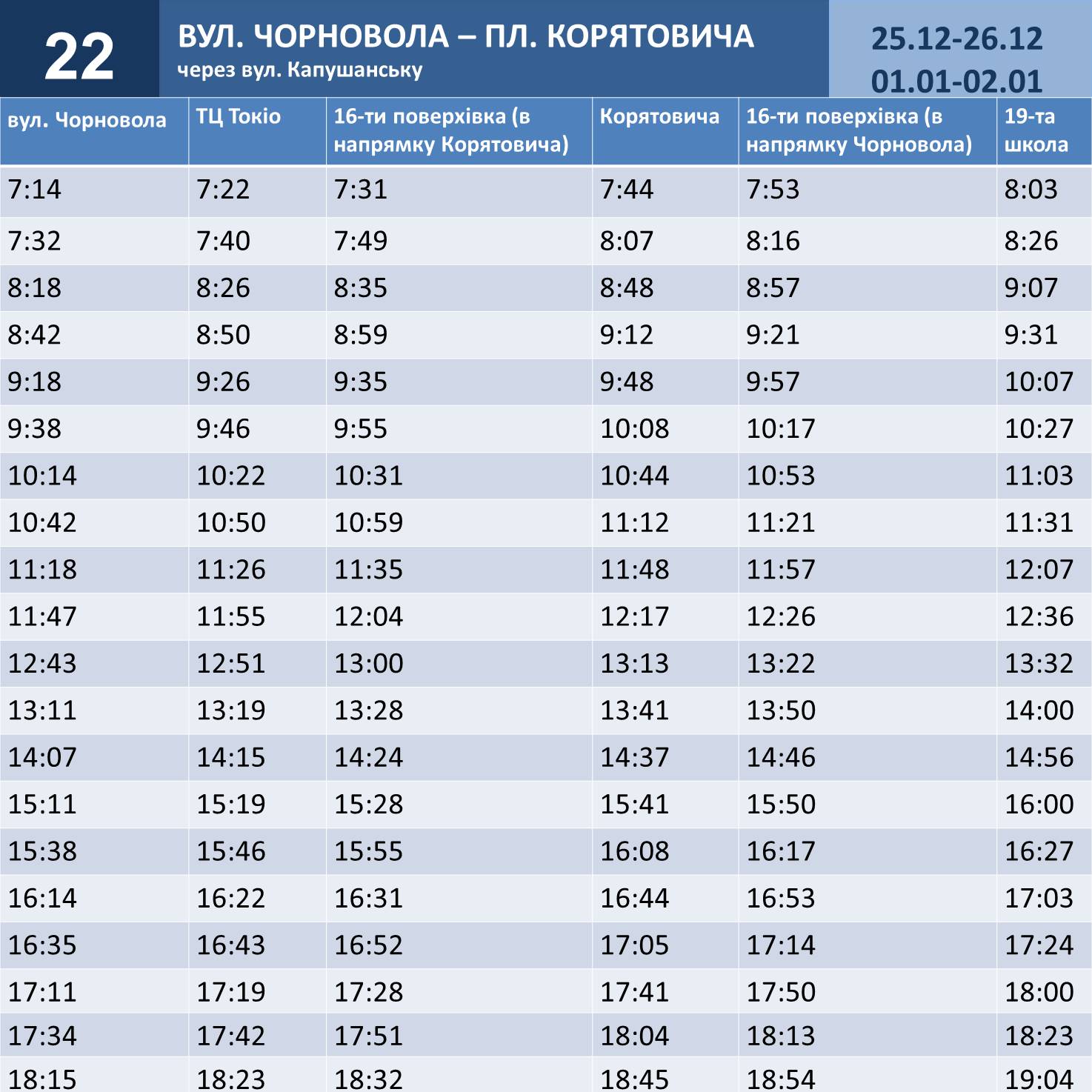 У період різдвяно-новорічних свят міські автобуси №9, №11, №18, №20, №22, №24 та №156 в Ужгороді курсуватимуть за оновленим графіком. Водночас автобус №38 не курсуватиме 25-28 грудня, а також 1-4 січня.