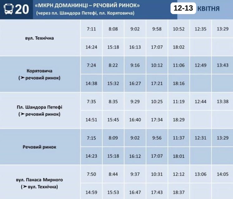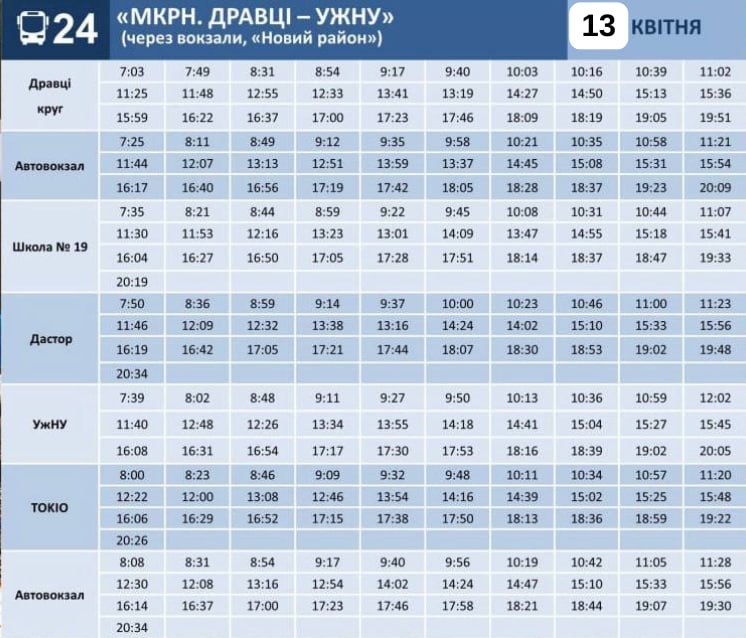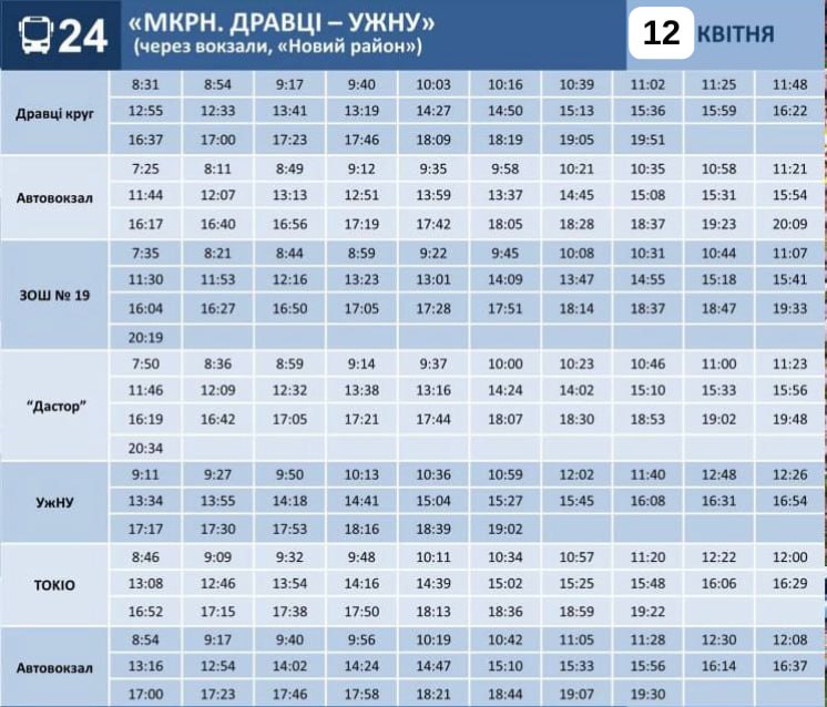 В Ужгороді змінили розклад руху міських автобусів №9, 18, 20, 22, 24 та 156 на Великодні свята 12-13 квітня. Актуальними графіками поділилися в Ужгородській міській раді.