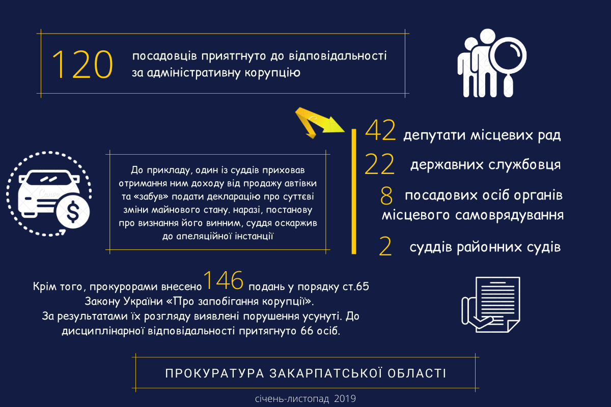 Крім того, упродовж 11 місяців 2019 року, органами прокуратури Закарпатської області внесено 146 подань у порядку ст.65 Закону України «Про запобігання корупції». За результатами їх розгляду усунуто виявлені прокурорами порушення та притягнуто до дисциплінарної відповідальності 66 осіб, повідомляє пресслужба прокуратури Закарпатської області