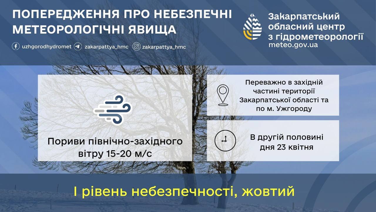 Про це попередили у Закарпатському гідрометцентрі. «В другій половині дня 23 квітня переважно в західній частині території Закарпатської області та по м. Ужгороду очікуються пориви північно-західного вітру 15-20 м/с (І рівень небезпечності, жовтий)», – йдеться у повідомленні.