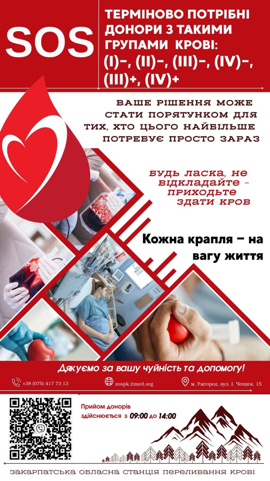 У Закарпатській обласній станції переливання терміново потребують донорів I−, II−, III−, IV− та III+, IV+ груп крові. Стати донорами можуть небайдужі віком від 18 років та вагою від 50 кг.