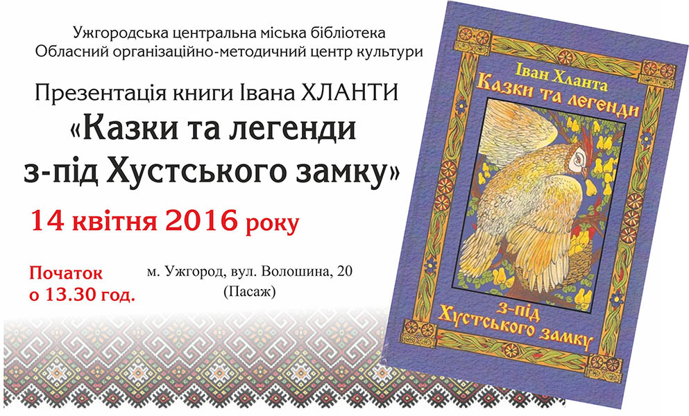 14 квітня 2016 року Ужгородська центральна міська бібліотека спільно з Обласним організаційно-методичним центром культури проведуть презентацію книги Івана Хланти «Казки та легенди з-під Хустського замку».