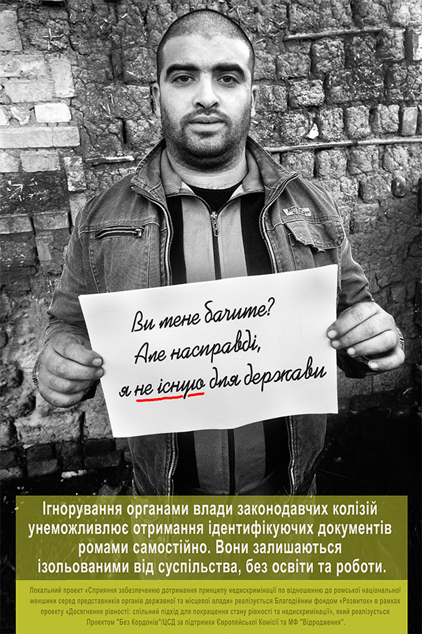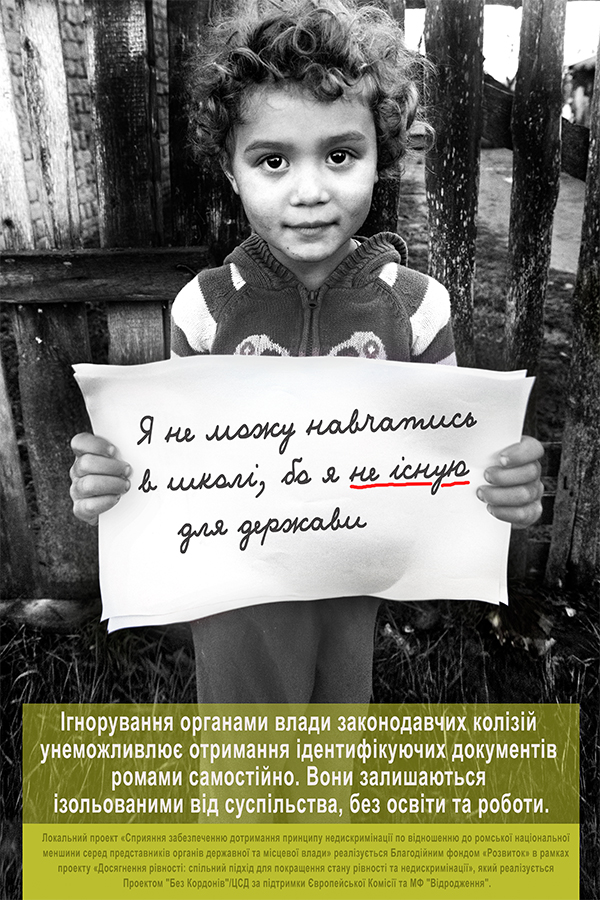 В рамках кампанії «Громадська адвокація щодо усунення законодавчих розбіжностей у видачі ідентифікуючих документів представникам ромської національної меншини», яка стартувала в жовтні 2015 року, працівники Благодійного Фонду «Розвиток» вирішили розробити соціальну рекламу, аби привернути увагу громадян та, особливо, представників органів влади до проблем відсутності ідентифікуючих документів у представників ромської національної меншини.