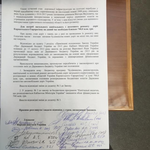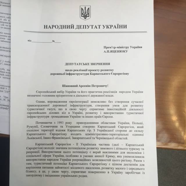 "Разом з колегами сьогодні написали депутатське звернення Прем’єр-міністру України Арсенію Яценюку щодо проекту розвитку дорожньої інфраструктури Карпатського Єврорегіону.