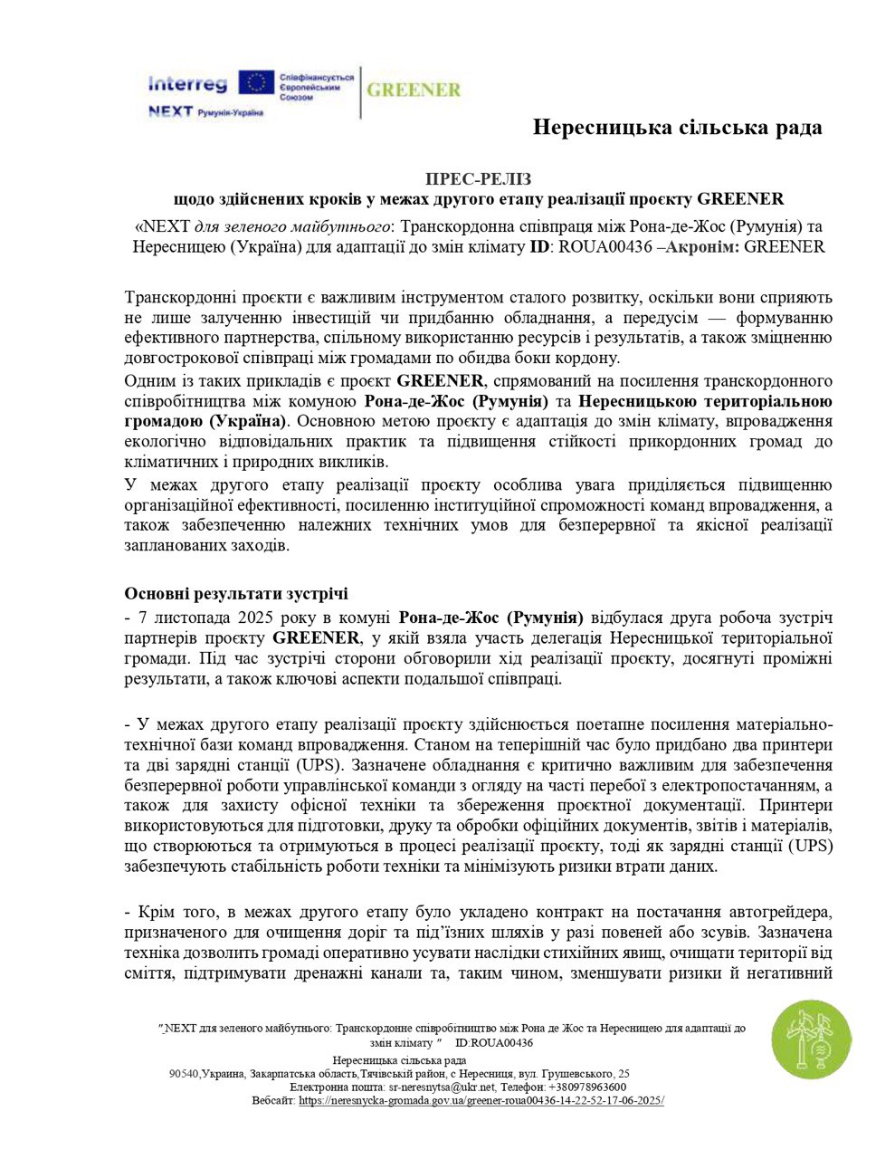 - 7 листопада 2025 року в комуні Рона-де-Жос (Румунія) відбулася друга робоча зустріч партнерів проєкту GREENER, у якій взяла участь делегація Нересницької територіальної громади. Під час зустрічі сторони обговорили хід реалізації проєкту, досягнуті проміжні результати, а також ключові аспекти подальшої співпраці.