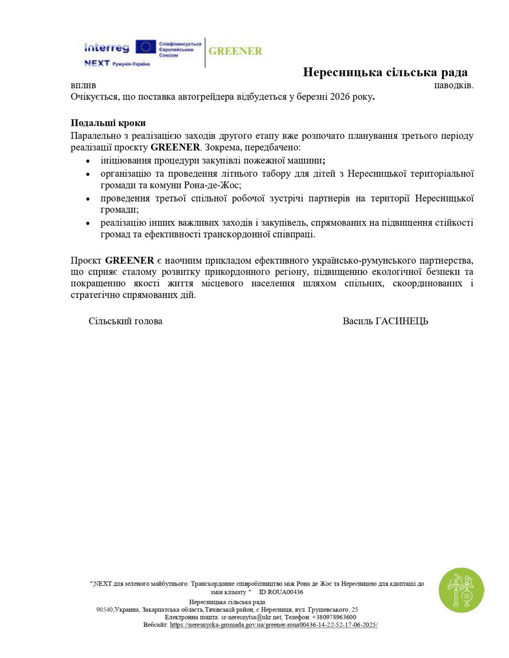 «NEXT для зеленого майбутнього: Транскордонна співпраця між Рона-де-Жос (Румунія) та Нересницею (Україна) для адаптації до змін клімату ID: ROUA00436 –Акронім: GREENER
