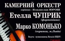 6 травня у Закарпатській обласній філармонії відбудеться концерт камерної музики за участю заслуженої артистки України Етелли Чуприк (фортепіано), соліста Львівської обласної філармонії, лауреата міжнародних конкурсів Марка Коломонька (скрипка) та Камерного оркестру філармонії (керівник - заслужений артист України В.Юрош).