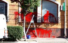 В Ужгороді «Сбербанк Росії» облили червоною фарбою. Це здійснила Закарпатська неформальна молодіжна організація «ФРОНТ ОПОРУ», про що вони повідомила сама.