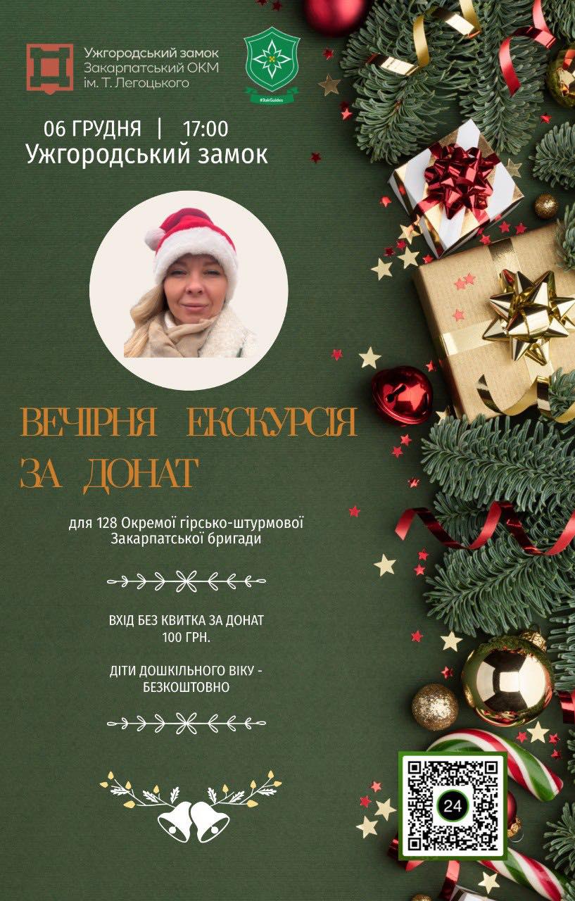 В Ужгородському замку у суботу, 6 грудня, відбудеться вечірня екскурсія. Взяти участь можуть усі охочі за донат від 100 гривень. Усі кошти спрямують на допомогу для воїнів 128 окремої гірсько-штурмової Закарпатської бригади.