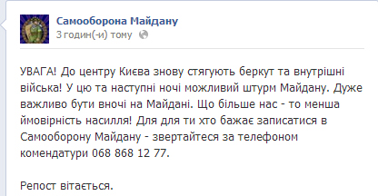 "УВАГА! До центру Києва знову стягують беркут та внутрішні війська! У цю та наступні ночі можливий штурм Майдану. Дуже важливо бути вночі на Майдані. Що більше нас - то менша ймовірність насилля!" – зазначено на сторінці.