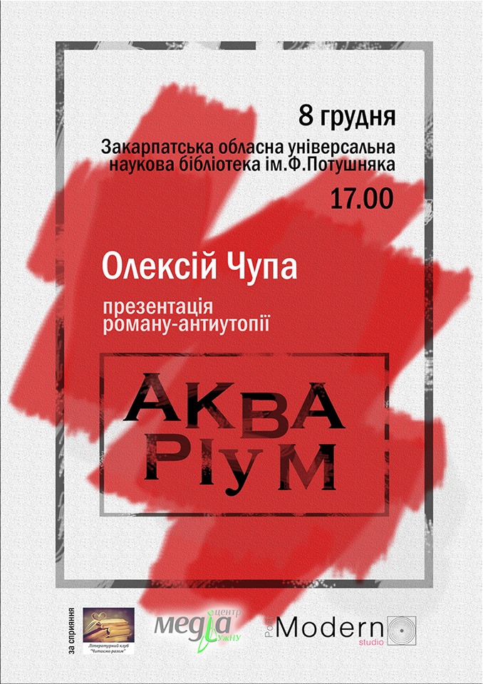 Автор презентує свій роман-антиутопію «Акваріум», що вийшов у серії сучасної української інтелектуальної прози «Вітражі» харківського видавництва «Віват». Зустріч модеруватиме поет і музикант Томаш Деяк. Місце зустрічі –Закарпатська обласна універсальна наукова бібліотека імені Ф.Потушняка (пр. Свободи, 16, 3 поверх).