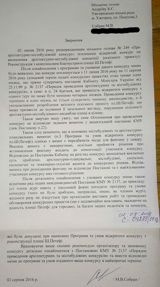 Розпорядження Ужгородського міського голови Б.Андріїва № 249 від 2 липня "Про архітектурно – містобудівний конкурс" з'явилося на сайті Ужгородської міськради 8 серпня.