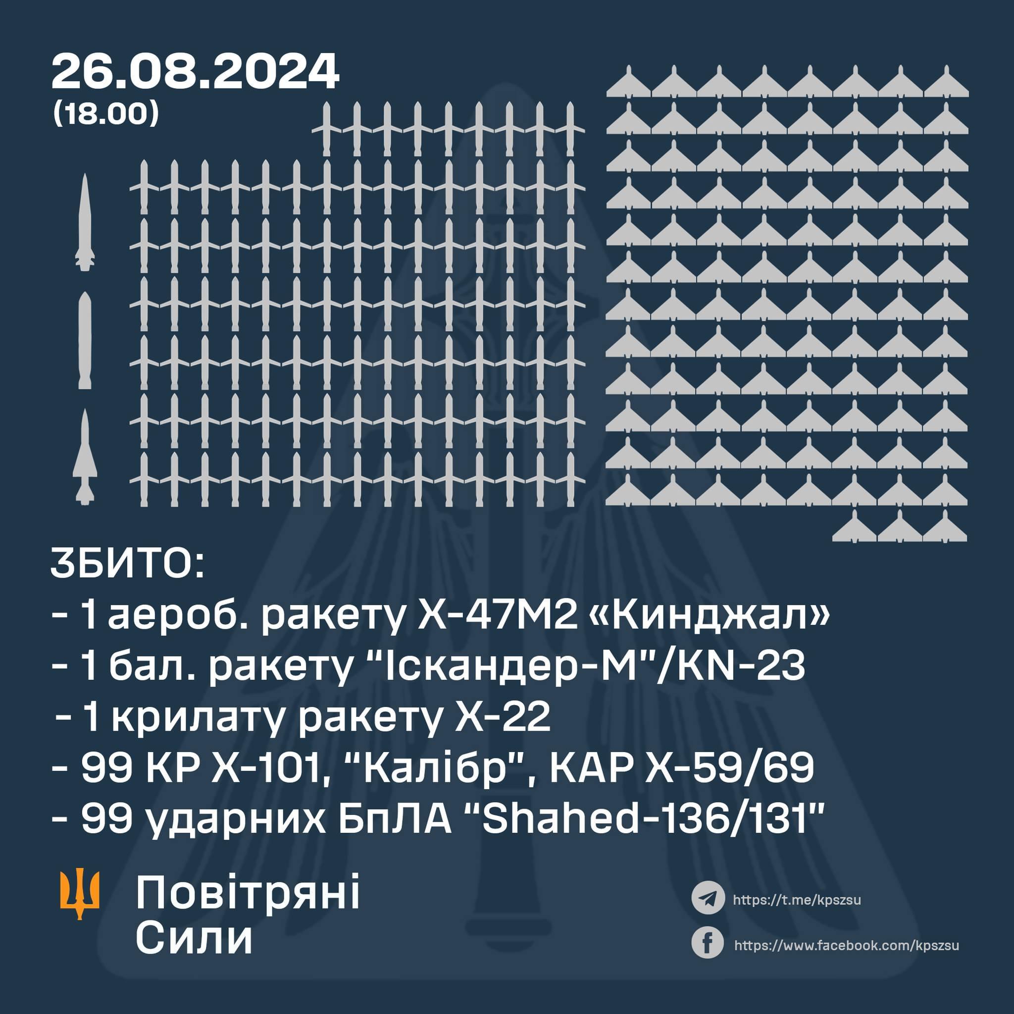 Усього радіотехнічними військами Повітряних Сил виявлено та супроводжено 236 засобів повітряного нападу противника: 127 ракет та 109 ударних БпЛА:
