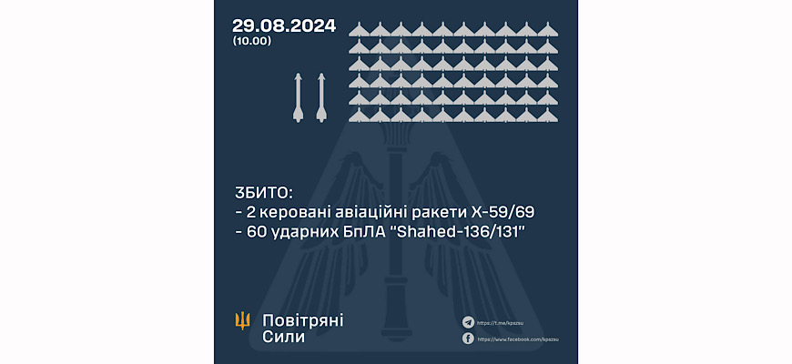 У ніч на 29 серпня 2024 року противник атакував Україні 3-ма керованими авіаційними ракетами Х-59/69 із повітряного простору Курської та Бєлгородської областей – рф., із цього ж напрямку – двома ракетами, тип яких наразі встановлюється, а також 74-ма ударними БпЛА типу «Shahed-131/136» з районів: Приморсько-Ахтарськ, Курськ, Єйськ.
